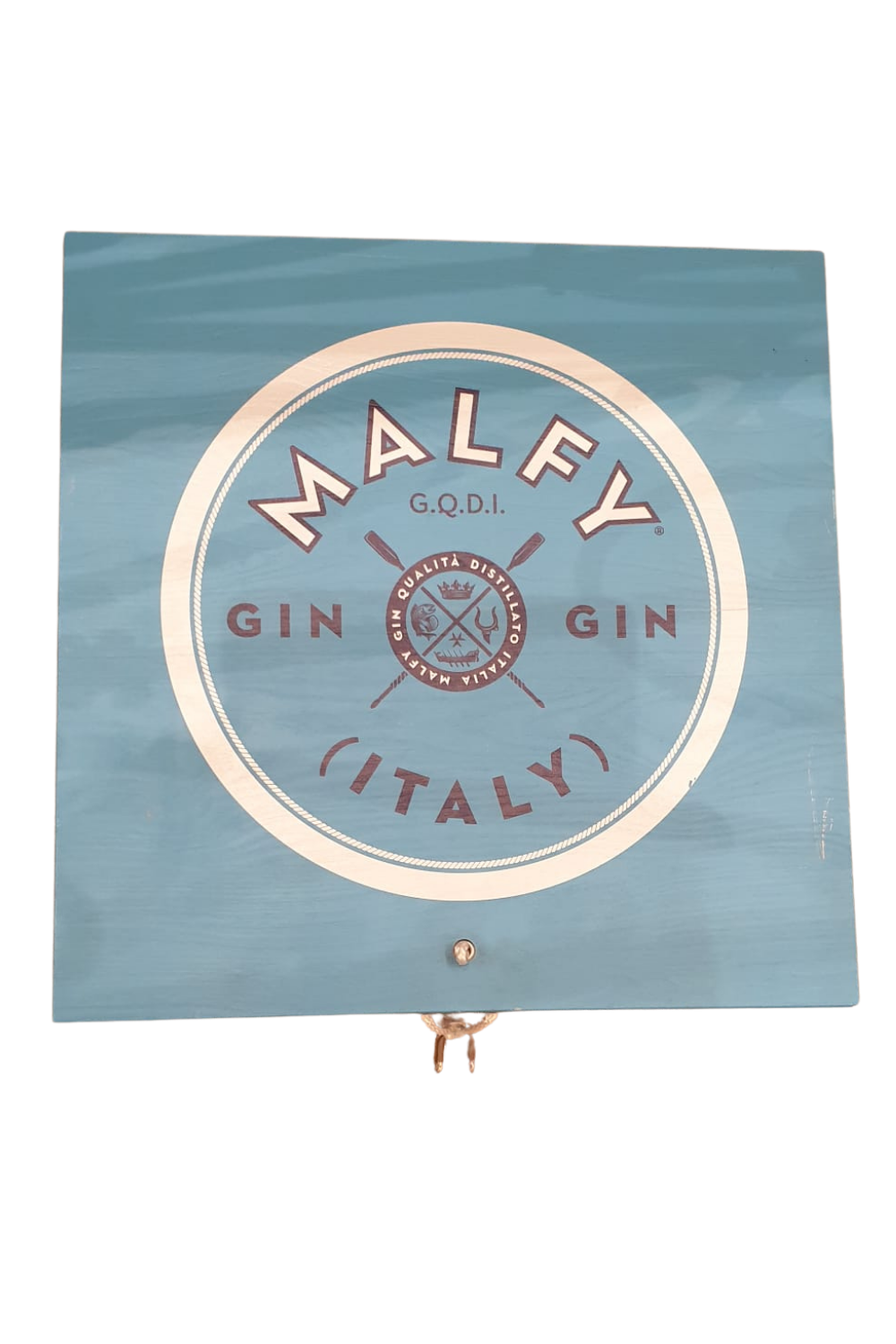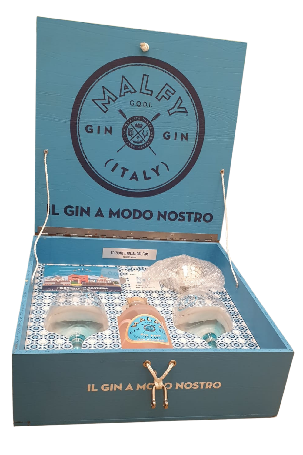 Box firmata Malfy Gin in legno.